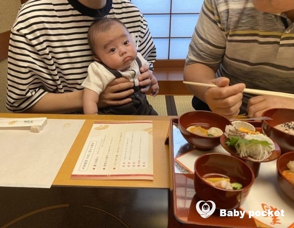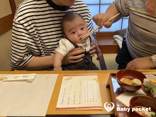 お食い初めの最中、運ばれてくる食べ物にこむぎ君は戸惑いながらも、泣くことなく終始穏やかに進めることができ、家族皆が楽しく行う事ができました。