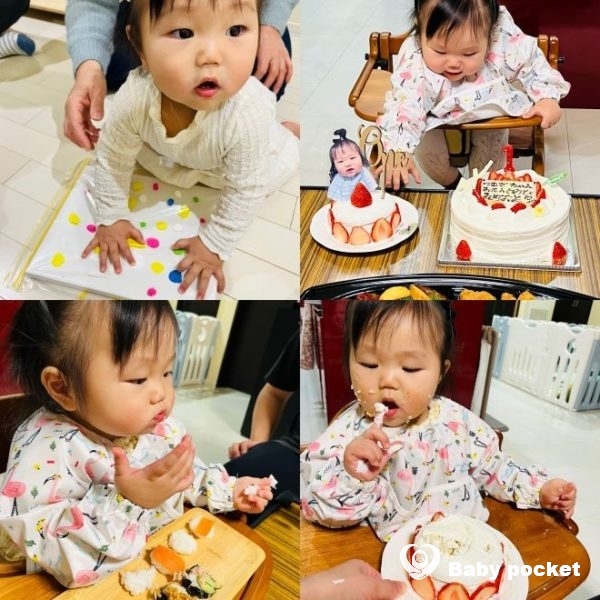 お祝いのご飯はお寿司とケーキ。初めて見るお寿司に戸惑いながらも、ネタの野菜を