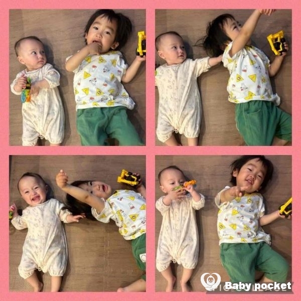 寝起きや機嫌の悪い時でも、近くでハルノヒくんの声がするとパッと顔を上げ、兄を見つけると手を振り回して喜びます。とてつもなくかわいいです。