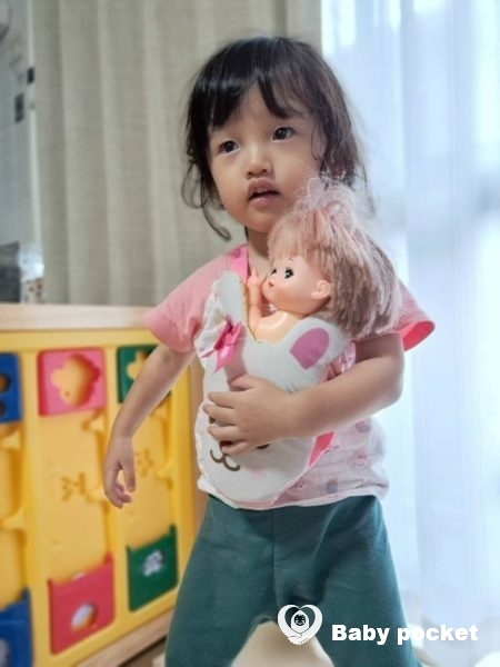 抱っこひもでメルちゃんを抱っこしたときは、自分の片手をメルちゃんの背中にまわし、時折とんとんとあやしているのです。しばらく抱っこしていると「おもいねー、そっと、そっとね」と言いながら、ゆっくりとバウンサーに降ろしていました。私がやっていることをよく観察しているのだなぁと感心します。