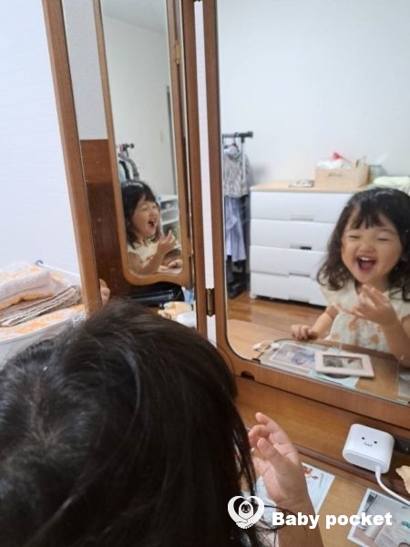 朝起きるとすぐに、「じぶん、みる?」と化粧台に行きたがり、自分のお顔を見てはニコニコしています。ニコニコするだけではおさまらず、吹き出し笑いのように手で口もとを隠しながら、キャッキャッと楽しそうに声を出して笑っているときもあります。
