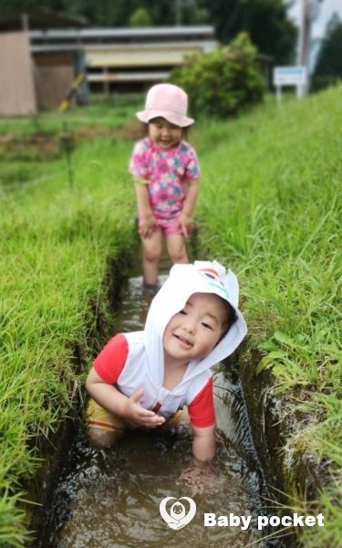 午前中は庭でプール遊びしたり,近くの用水で水浴びしたり。子育て支援センターに出向き,遊ぶこともあります。