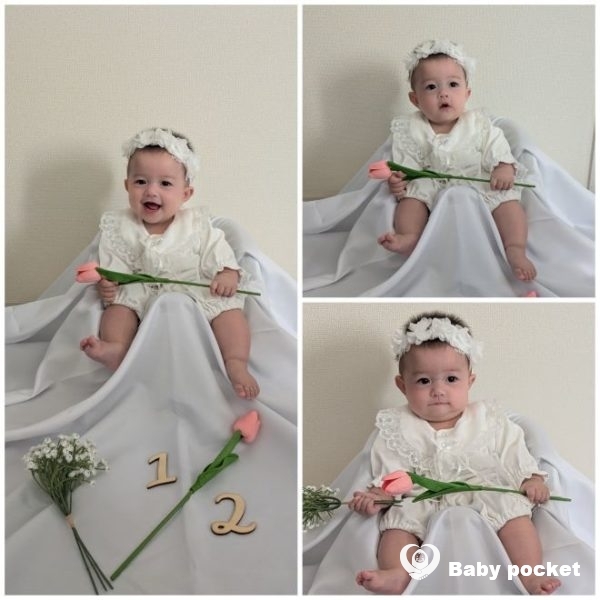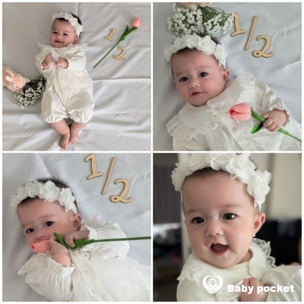 ハーフバースデーの日には白いベビードレスに身を包み、可愛い写真をたくさん撮ってお祝いしました。