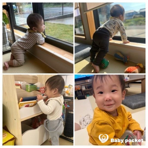 掴まり立ちも得意で、初めは窓に黄昏ながら掴まり立ちをして、徐々に本棚やテーブル、ベビーゲートにも手を伸ばし始めました。