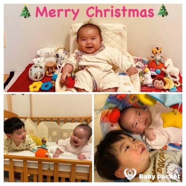 ひとり遊びも上手で、プレイマットのアーチにつけたクリスマスベルに手を伸ばしてチリンチリンと鳴らしたり、オーボールを握ってしゃぶったりしています。