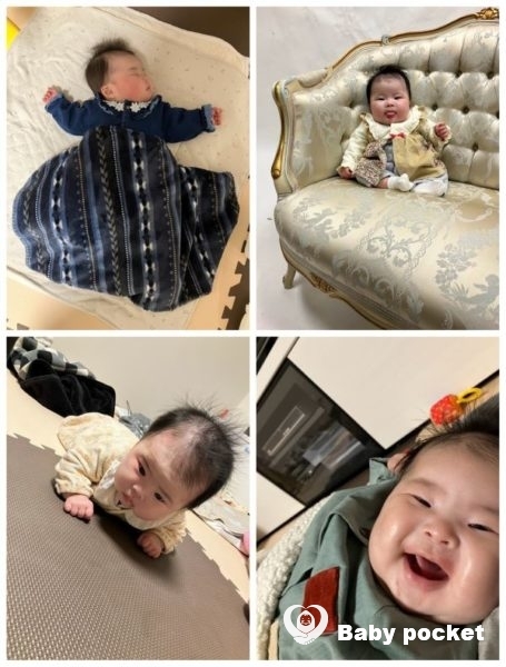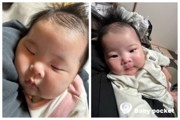 首がすわり縦抱っこができるようになったため、視界が広がり、きょろきょろとあたりを見回すようになりました。