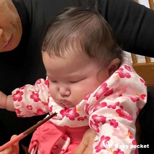 お食い初めの儀式はおばあちゃんにやってもらいましたが、口の前に運ばれる初めての食べ物に少し警戒したのか、口を結んで固まっていました。