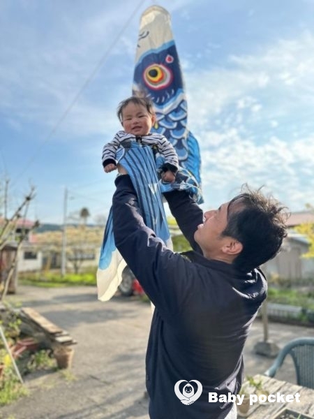 元気に大きくなりますようにと願いを込めて鯉のぼりと一緒に空に高く高く抱っこしてもらいました。