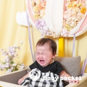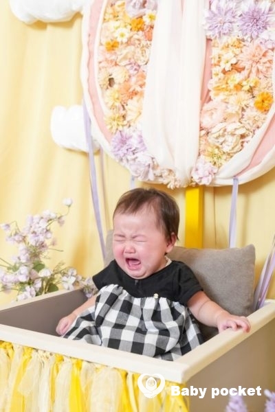 次に単独で撮影です、、はい、即号泣です。おもちゃ作戦、おやつ作戦、全滅です。冷房が効いたお部屋で汗だくの父母、カメラマンさん、、一旦休憩しますか?とご配慮のお言葉を頂いたのですが、次に撮影のご家族もいるのと、、この時期しかない場所見知り、人見知りの号泣写真、逆に貴重では?とそのまま可愛い泣き顔で撮影して頂きました。