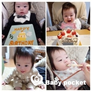 ハーフバースデーはお家で飾り付けをし、お祝いしました。離乳食はお祝いのプレートにしました。いつもと違うプレートを「何だ、これ?」というように見ていたるーちぇ君でしたが、あっという間に完食してくれました。