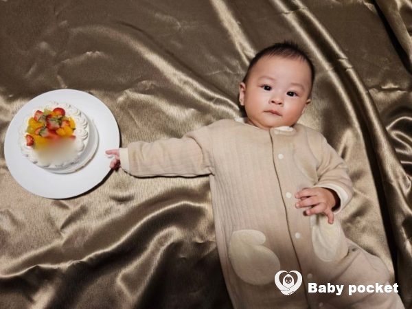 生後6か月当日は、ケーキでお祝いしました。人が大好きで、顔を見るとにこっと笑うファンタくんに、ケーキ屋の店員さん達もめろめろでした。初めて行ったケーキ屋さんだったのに「ファンタくん、また来てね!」と店員さん達に盛大に見送られました。