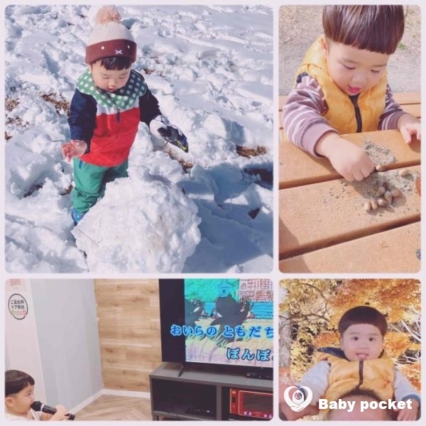 2歳の誕生日からこの半年、夏は大大大好きな水遊びをたくさんして、秋には落ち葉やどんぐりに夢中になり、先日雪が降りさっそく雪だるまを作って、体いっぱい四季をエンジョイしています。
