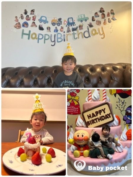 誕生日当日は、お家で母お手製ケーキでお祝いしました。誕生日のお歌が流れケーキが運ばれてくると照れた様子を見せ、ケーキに飾りつけしてあるバイキンマンを見て喜んでくれました。