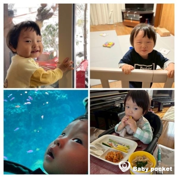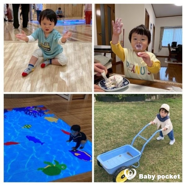 ことばは意味のある単語をはなし、「はい、どうぞ」「ねんね」「ねえねえ、とと(父)」「ばいばい、(さよならの)タッチ」と状況に応じたやり取りができるようになりました。最近は読んでほしい絵本を持ってきて大人の膝の上に座る、お絵描きノートにシールを貼ることに夢中になっております。
