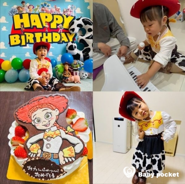 お誕生日には大好きなトイ・ストーリーのジェシーになりきってお誕生日パーティーをしました。服も小物も髪型もジェシーになりきり、乗る馬がないのでラフィーにまたがりカウガールになりきって「ヒーハー!!」とジェシーのセリフを真似ながらお誕生会に登場しました。