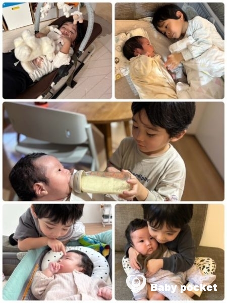 該当の連絡をもらい準備を進めていく中で、赤ちゃん用のベッドやバウンサーに寝たり、新しいお洋服やタオルの準備中も『ぼくのは?』と半泣きで聞いてきたりと、やはり現実的にはよく理解できていなかったようでしたが、初日から妹に寄り添って寝たがったり、優しく触れたりと、新たな一面も見ることができました。