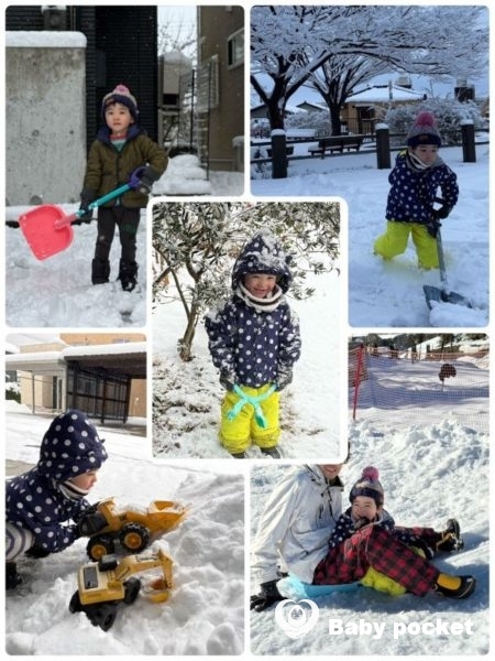 ソリ遊びをしたり、重機のおもちゃを雪山に走らせたり、隠れて雪を食べたり、雪国の冬を大満喫しています。