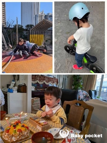 お待ちかねのお誕生イベントは、母方の祖父母とレストランに行ったり、父方の実家で祖父母と一緒に食事をしたりと、お楽しみを満喫しました。ケーキに立てた3本のローソクの火を懸命に吹き消そうとするエンポリオくん、頑張りすぎて火傷したら大変なので、お父さんがアシストして一緒に吹き消してあげました。