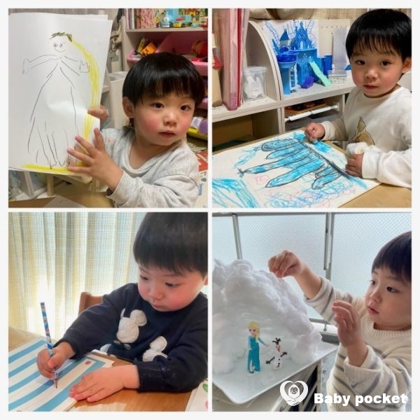 「エルサは北の山の頂上に行きました」などとひとり語りしながらエルサの氷の城やラプンツェルの長い髪を画用紙に何枚も描きました。