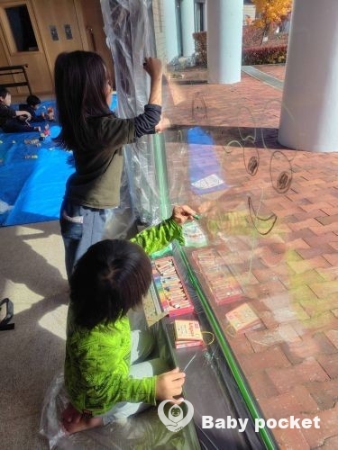 水で落とせるので、会場の大きな窓にもキットパスでお絵描きをして楽しめました。