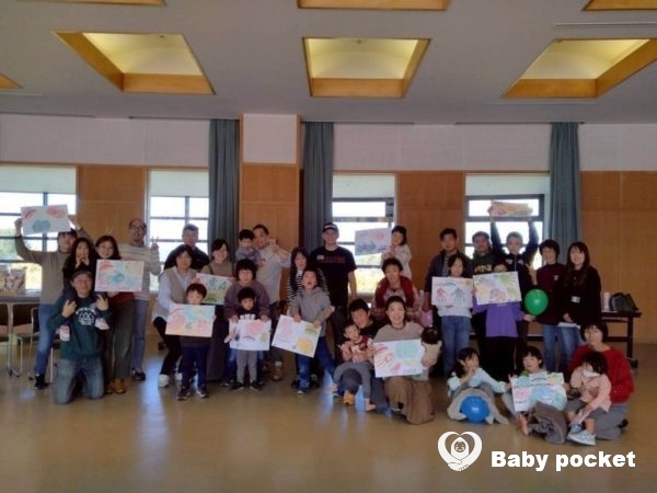 そしてメインの手形アート作り。“キットパス”という、見た目はクレヨンですが水で簡単に落とせる画材で手に色を付け、紙にペタッ。採れた手形に目や口を書き加え、ゾウや魚にします。大きい子供がいるファミリーは1枚の紙に収まりきらない位の力強い絵に、小さな子供は小さなゾウや魚がいる可愛らしい絵に。それぞれカラフルで個性あふれる作品が完成しました。