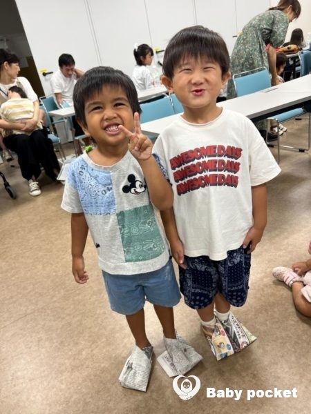 ワークショップの最後は、防災スリッパづくりです。新聞紙1枚あれば作れる、有事に足を守るスリッパの折り方を教えてもらいました。完成したスリッパが気に入って、部屋中走り回っている子供たちもいました。