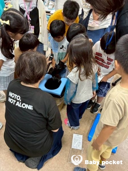 続いて、災害で水道が使えなくなったときのトイレについて教えてもらいました。尿に見立てたペットボトルの水が、凝固剤を使って固まっていく様子を子供たちは興味津々で観察していました。さらに、固まった水を持ち上げてみると、その重さにびっくりです。衛生的に処理をするための大変さを、身をもって学びました。